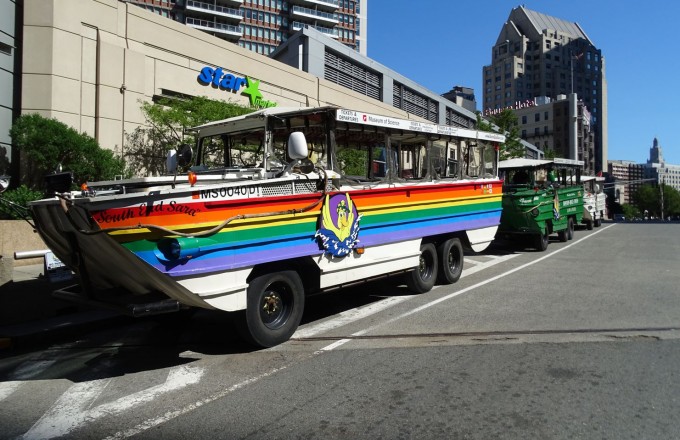 Und los geht es! Wir fahren durch die Hauptstadt des Bundesstaates Massachusetts mit einem quietschbunt gestalteten Amphibienfahrzeug und erregen schon von weitem große Aufmerksamkeit. Das Fahrzeug, das seinen Ursprung aus der Zeit des 2. Weltkrieges hat, ist zunächst zu Lande unterwegs und passiert die wichtigsten Sehenswürdigkeiten von Boston, die von einem Fahrer mit Entertainerqualitäten kurzweilig erklärt werden. Es geht vorbei an besonderen Bauwerken und Gebäuden, an Grünflächen, schönen Plätzen, bevor wir dann plötzlich mit Schwung in den Fluss abbiegen, auf dem wir eine ausgedehnte Runde drehen. Der Blick vom Wasser auf die Stadt lässt uns viele neue Eindrücke gewinnen. Nach rund 80 Minuten (60 Minuten auf dem Land, 20 Minuten auf dem Fluss) geht eine spannende Einführung in Geschichte, Kultur sowie Klatsch und Tratsch von Boston zu Ende. Schade! Wir hatten viel Spaß und haben gleichzeitig viel Neues von Boston erfahren.