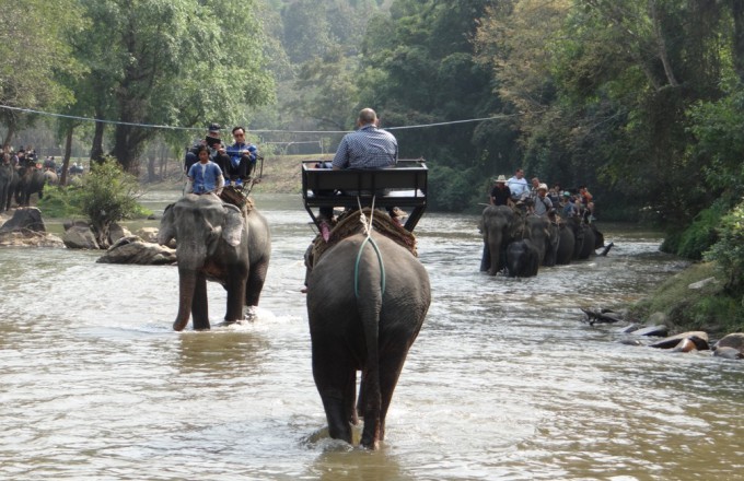 Wer noch mehr in Thailand eintauchen will, kann Chiang Mai als Basislager für Touren in die Umgebung nutzen. Wir entscheiden uns für eine rund fünfstündige Tour in die Gegend nördlich von Chiang Mai, genauer gesagt in den Maetaeng Elephant Park. Er liegt rund 50 km oder eine Stunde Fahrzeit entfernt in dichtem Waldgebiet. Für den Fahrer nebst Minibus, die uns die ganze Zeit zur Verfügung stehen, werden dafür 1.800 THB (Thailändische Baht, ca. 48 Euro) berechnet. Im Maetaeng Elephant Park entscheiden wir uns für eine Kombination aus vier Aktivitäten zum Preis von insgesamt 1.850 THB (ca. 49 Euro) pro Person: eine Fahrt mit dem Ochsenkarren, den Besuch der Langhalsfrauen im Hill Tribes Village, Elefantenreiten über Land und durch den Maetaeng Fluss sowie eine Fahrt mit dem Floß flussabwärts (rund 4 km).