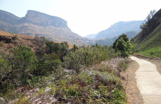 Die Hinfahrt führt entlang zahlreicher ursprünglicher Dörfer durch eine sehr reizvolle Landschaft in den Ausläufern der Drakensberge. Unser Ziel ist der Royal Natal Nationalpark in den nördlichen Drakensbergen (Northern Drakensberg Mountains), die die natürliche Grenze zu Lesotho darstellen. An der Einfahrt zum Nationalpark entrichten wir den Eintritt von 30 ZAR (Südafrikanischer Rand, ca. 1,90 Euro) pro Person und fahren weiter bis zum äußersten Punkt, dem Parkplatz nahe des Thendele Camps. Von dort aus führt ein sechsstündiger Wanderweg hinein in das beeindruckende "Amphitheater", ein riesiges Halbrund innerhalb des Bergmassivs, durch die Tungela Schlucht bis zu den Tungela Wasserfällen. Aufgrund der großen Hitze an diesem Tag gehen wir nur die erste, bewaldete Teilstrecke des Wanderweges bis ans Ende des Waldes, das wir nach rund 20 Minuten erreichen. Dort erschließt sich uns ein toller Blick auf das Bergmassiv mit mehreren 3000ern.
