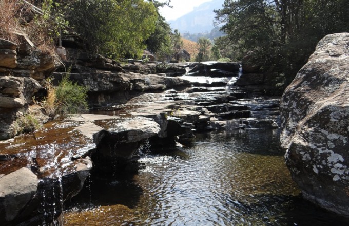 Nach zahlreichen Fotos nehmen wir den Weg zurück zum Auto und fahren in einen anderen Teil des Nationalparks, Mahai genannt, und parken nahe dem gleichnamigen Campingplatz. Von dort schlängelt sich ein zunächst befestigter, sogar mit einem Rollstuhl zu absolvierender Weg den Fluss hinauf, der später in einen unbefestigten Felsenpfad übergeht – unser Ziel: Cascades, die Kaskaden, in denen man auch baden kann. Nach einer guten halben Stunde erreichen wir die Kaskaden und erfreuen uns am Anblick der Drakensberge aus einem völlig anderen Blickwinkel. Hier machen wir eine längere Pause an den Kaskaden, bevor wir zum Parkplatz zurückkehren. Für die gesamte Tour inklusive Anfahrt und Rückfahrt benötigen wir rund sechs Stunden.