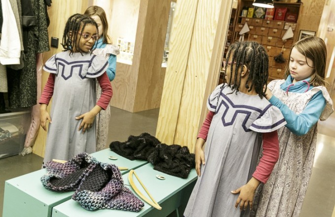 Wir begeben uns anschließend auf die Ebene 2, in der die Wechselausstellungen untergebracht sind. Zur Wiedereröffnung des Museums wird noch bis September 2018 auf die Geschichte der Museumsausstellungen eingegangen: Die Eröffnungsausstellung "WOW! Das Beste aus 45 Jahren Kindermuseum" ist ein Streifzug durch die Museumsgeschichte und zeigt einen Zeitstrahl, der mit Fotos, Plakaten und Erinnerungen an Kindermuseumsbesuche seit der Eröffnung 1972 bestückt ist. Unsere Kinder nehmen begeistert auf alten Schulbänken eines historischen Klassenzimmers aus der Zeit um 1900 Platz und probieren auf Schiefertafeln die Sütterlinschrift aus. Daneben werden historische Spielzeuge, Spiele und Spielzeugtiere aus der Spielzeugsammlung präsentiert. In einem Schattenzimmer können Schattenschnitte erzeugt werden, mit denen hinter einer großen Leinwand Theater gespielt wird.