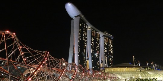 Wir beginnen unseren Aufenthalt mit einem Besuch des Luxushotels Marina Bay Sands, berühmt für seinen Infinity Pool mit grandioser Aussicht auf die Skyline von Singapur. Die Zimmerpreise liegen hier zwar spürbar oberhalb unseres Budgets, aber wir genehmigen uns den einen oder anderen Cocktail in der Roof Top Bar der Hotel-Dachterrasse, dem Sands SkyPark. Die Aussicht speziell zum Sonnenuntergang ist atemberaubend: Wir überblicken von hier aus die funkelnde Skyline der Stadt, die bunte Fußgängerbrücke "The Helix", das Riesenrad "Singapore Flyer" im Farbwechsel und den futuristischen Stadtpark "Gardens by the Bay" - und unsere Kamera steht nicht mehr still!